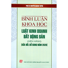 Cuốn sách phân tích, làm rõ nội hàm của các điều luật; gắn bình luận từng điều, khoản với bối cảnh thực tiễn thực thi Luật Kinh doanh bất động sản năm 2014; phân tích những điểm mới của Luật Kinh doanh bất động sản năm 2014, sửa đổi, bổ sung năm 2020 so với Luật Kinh doanh bất động sản năm 2006. Cuốn sách là tài liệu tham khảo hữu ích cho các cơ quan nhà nước, các nhà hoạch định, xây dựng và thực thi chính sách, pháp luật, các nhà đầu tư trong và ngoài nước và cho tất cả những ai quan tâm tới lĩnh vực này.Giá sản phẩm trên Tiki đã bao gồm thuế theo luật hiện hành. Bên cạnh đó, tuỳ vào loại sản phẩm, hình thức và địa chỉ giao hàng mà có thể phát sinh thêm chi phí khác như phí vận chuyển, phụ phí hàng cồng kềnh, thuế nhập khẩu (đối với đơn hàng giao từ nước ngoài có giá trị trên 1 triệu đồng).....