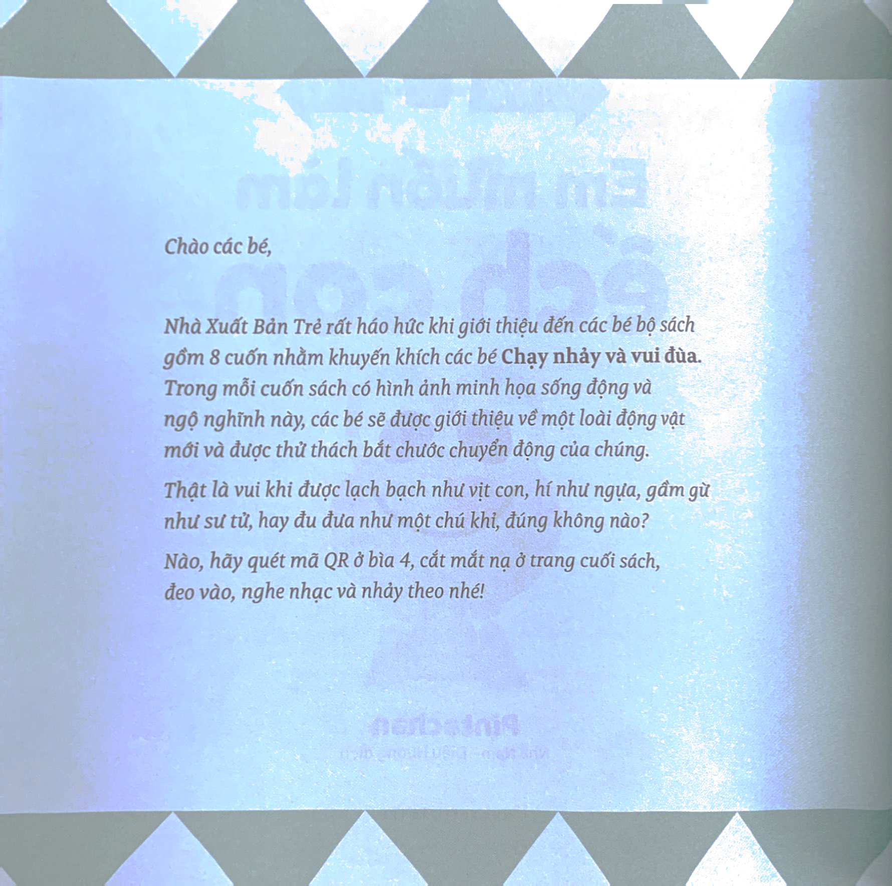Bộ sách "Chạy Nhảy Và Vui Đùa" là một loạt truyện tranh tương tác dành cho trẻ em, giúp các bé mô phỏng theo hoạt động của các loài vật. Mỗi cuốn sách tập trung vào một loài vật khác nhau, như thỏ, vịt, sư tử, ngựa, khủng long, ếch, khỉ và chim cánh cụt.