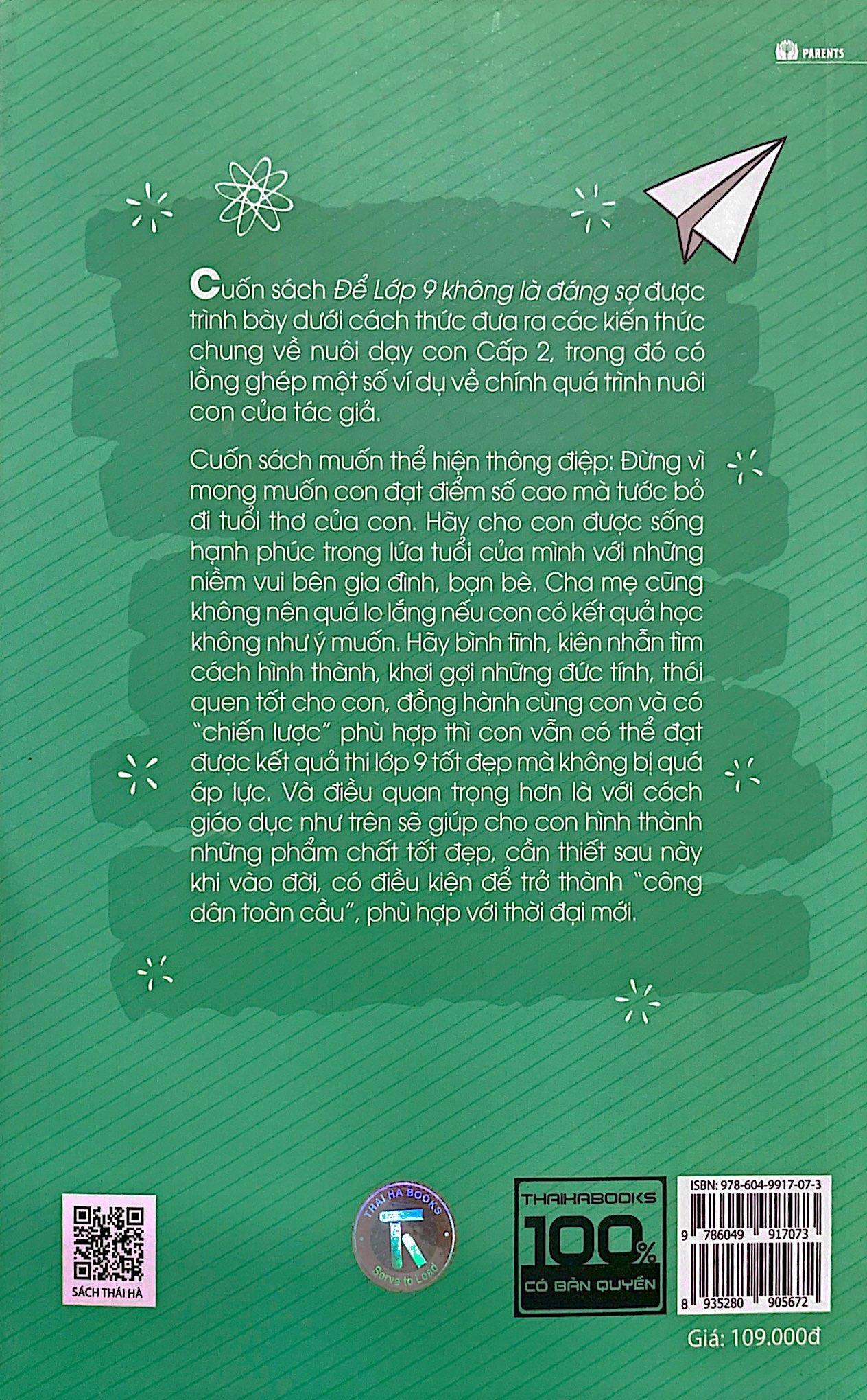 Mặc dù đã “hoạch định” những chiến lược rất cụ thể, nhưng trong quá trình nuôi dạy con, nhất là năm Lớp 9, cũng giống như bao phụ huynh khác, tôi không khỏi có những lúc hoang mang, bối rối, không biết tìm hiểu thông tin ở đâu, không biết định hướng cho con và đồng hành cùng con như thế nào mới là tốt nhất. Với sự tích lũy, đúc kết tri thức và trải nghiệm trong quá trình nuôi dạy con suốt những năm qua, tôi đã viết cuốn sách “Để lớp 9 không là đáng sợ” với hy vọng sẽ cung cấp cho các bậc phụ huynh có con học Cấp 2 những thông tin hữu ích, giúp quá trình đồng hành cùng con được hiệu quả hơn và không bị hoang mang, lo lắng khi con đứng trước kỳ thi tốt nghiệp THCS.
