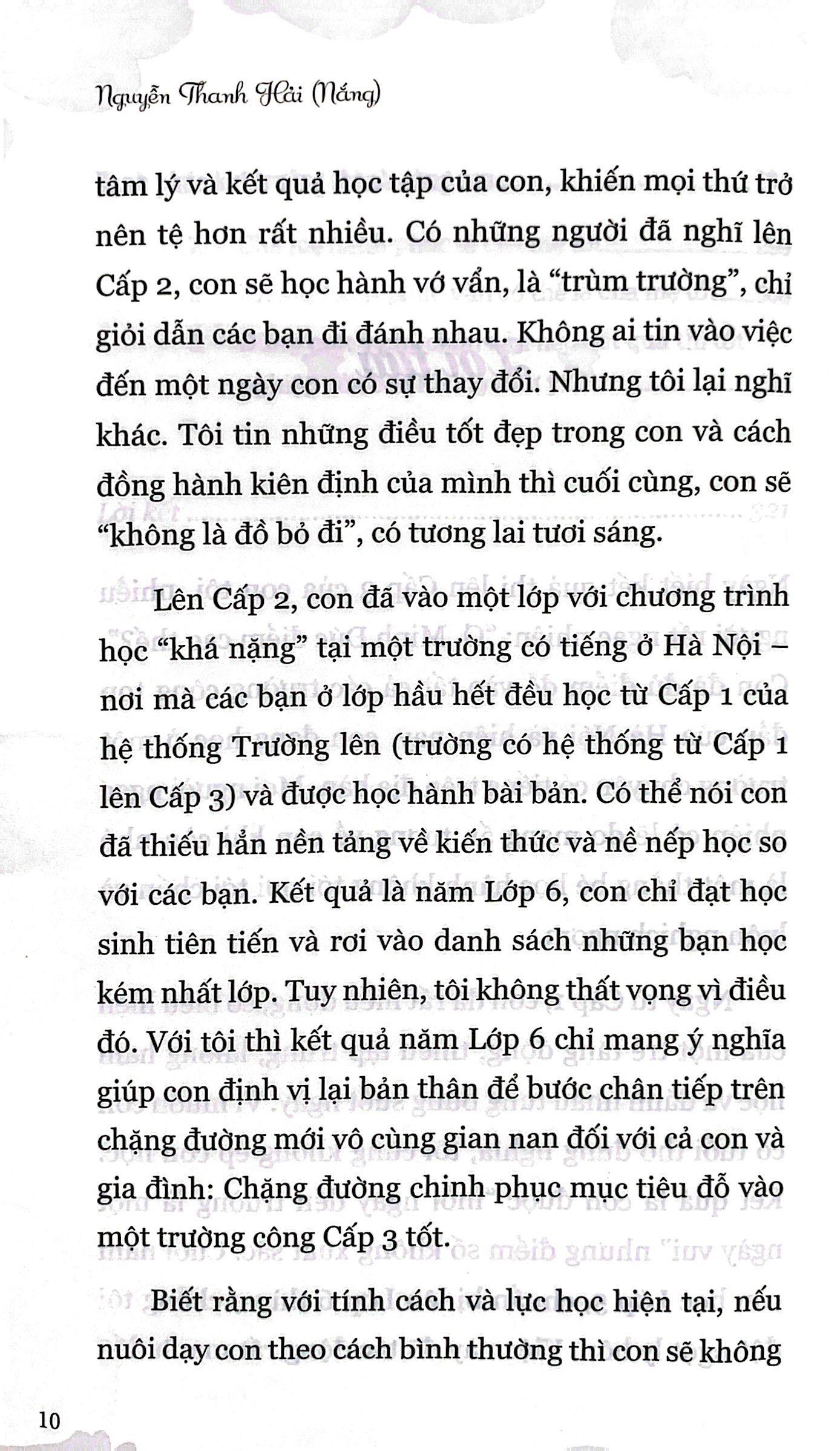 Lên Cấp 2, con đã vào một lớp với chương trình học “khá nặng” tại một trường có tiếng ở Hà Nội – nơi mà các bạn ở lớp hầu hết đều học từ Cấp 1 của hệ thống Trường lên (trường có hệ thống từ Cấp 1 lên Cấp 3) và được học hành bài bản. Có thể nói con đã thiếu hẳn nền tảng về kiến thức và nề nếp học so với các bạn. Kết quả là năm Lớp 6, con chỉ đạt học sinh tiên tiến và rơi vào danh sách những bạn học kém nhất lớp. Tuy nhiên, tôi không thất vọng vì điều đó. Với tôi thì kết quả năm Lớp 6 chỉ mang ý nghĩa giúp con định vị lại bản thân để bước chân tiếp trên chặng đường mới vô cùng gian nan đối với cả con và gia đình: Chặng đường chinh phục mục tiêu đỗ vào một trường công Cấp 3 tốt.