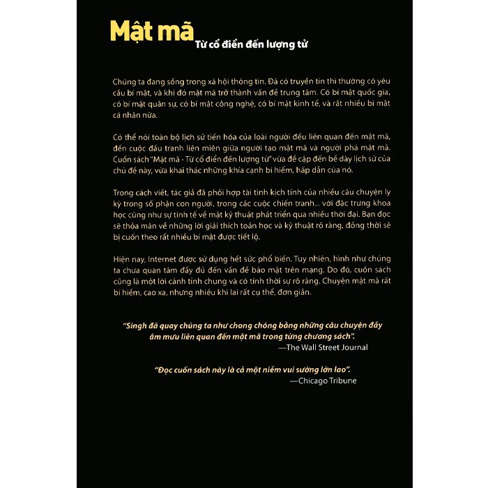 “Trong hàng ngàn năm, vua chúa cũng như các tướng lĩnh đều dựa vào mạng lưới thông tin liên lạc hiểu quả để cai trị đất nước và chỉ huy quân đội của mình. Đồng thời, tất cả họ đều ý thức được những hậu quả của việc để lọt thông tin của mình vào tay đối phương, để lộ những bí mật quý giá cho các nước thù địch cũng như hậu quả của sự phản bội cung cấp thông tin sống còn cho các lực lượng đối kháng. Chính nỗi lo sợ bị kẻ thù xem trộm đã thúc đẩy sự ra đời và phát triển của mật mã: đó là những kỹ thuật nhằm che giấu, ngụy trang thông tin, khiến cho chỉ những người cần được nhận mới có thề đọc được.