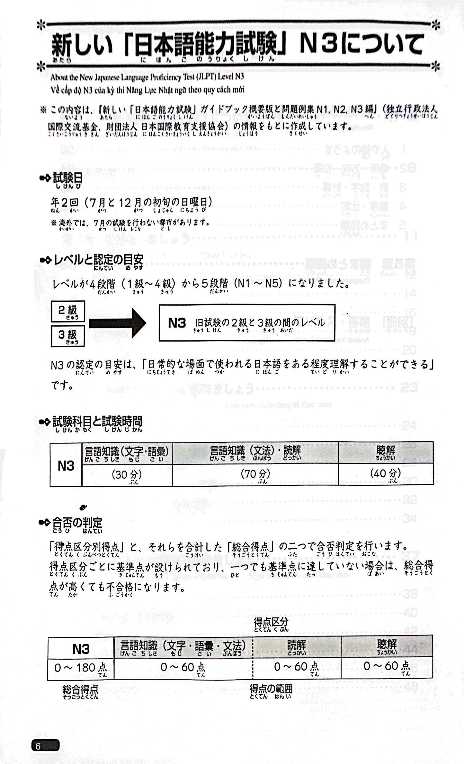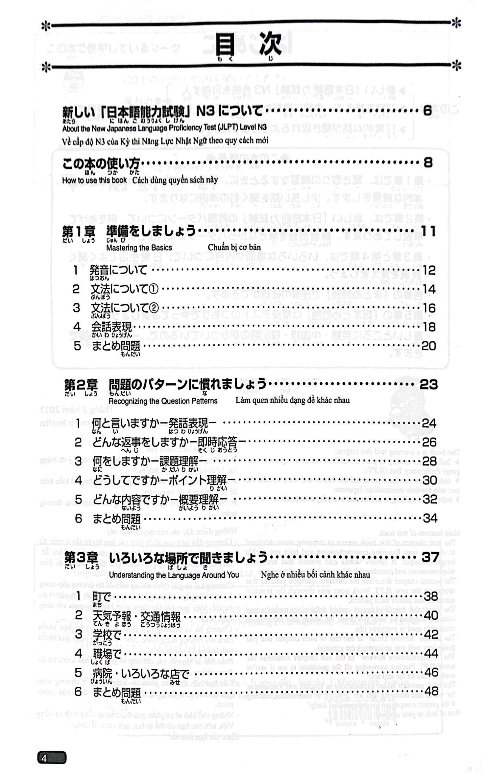 Bộ sách Nihongo somatome N3 này được xuất bản nhằm giúp bạn có được những kiến thức cần thiết một cách nhanh chóng, hiệu quả và hoàn thành tốt kỳ thi năng lực Nhật ngữ N3. Bộ sách này có 5 quyển: Hán tự (Kanji), Từ vựng (Goi), Đọc hiểu (Dokkai), Nghe hiểu (Choukai) và Ngữ pháp (Bunpou), do Nhà xuất bản ASK xuất bản và là một trong số các tựa sách học tiếng Nhật hàng đầu trong hệ thống phân phối sách Kinokuniya lớn nhất Nhật Bản. Hi vọng bộ sách sẽ giúp các bạn chuẩn bị tham gia kỳ thi năng lực Nhật ngữ JLPT nắm được những nội dung kiến thức cần phải có trong năng lực Nhật ngữ N3 một cách nhanh chóng, hiệu quả và tổng quát nhất trong khoảng thời gian từ 4 đến 6 tuần.