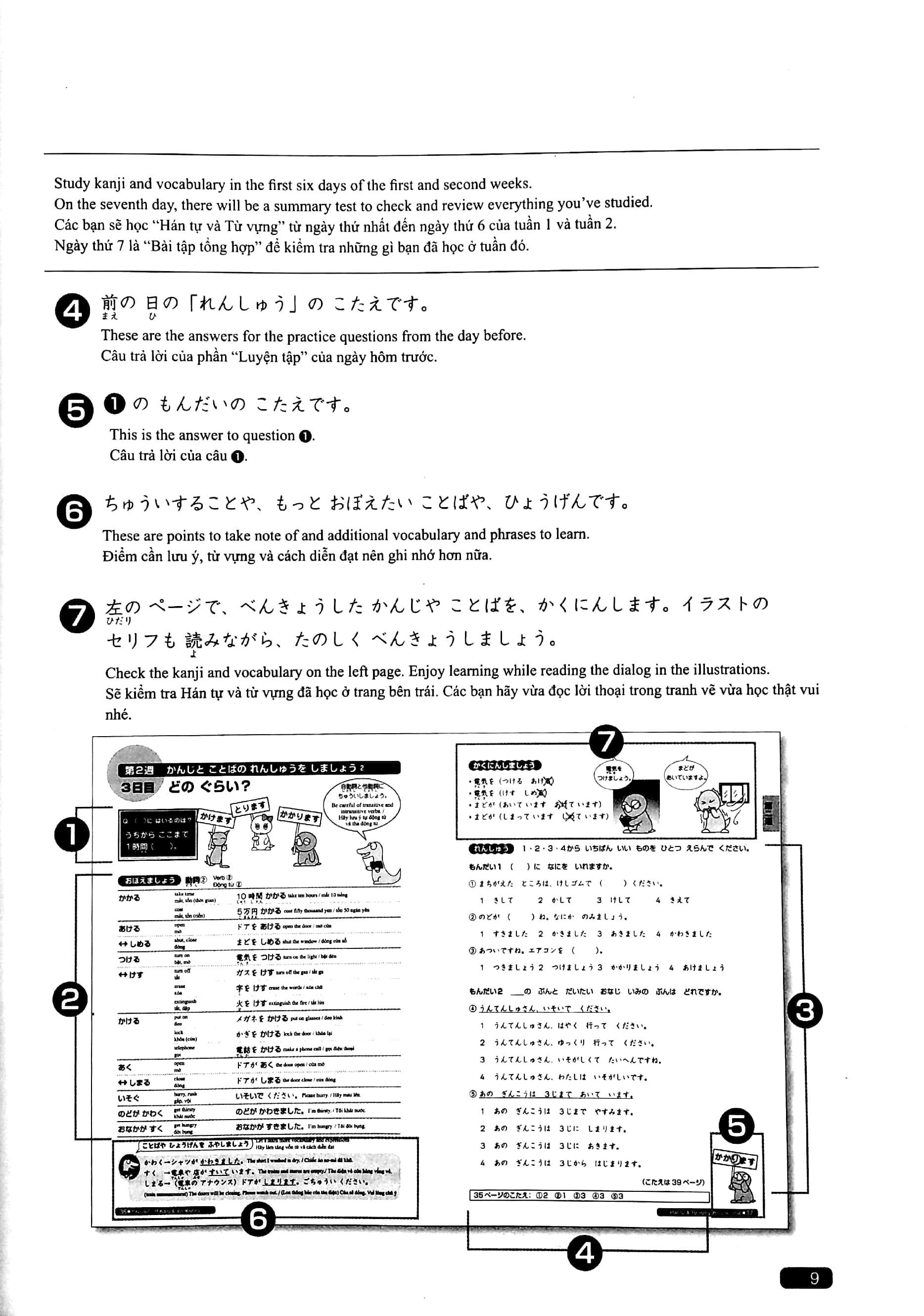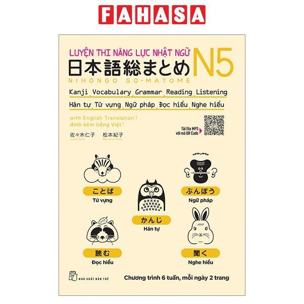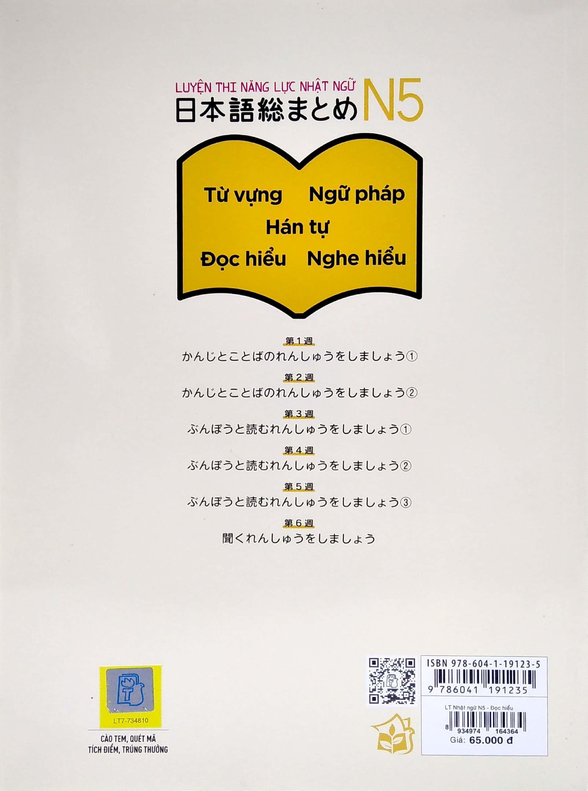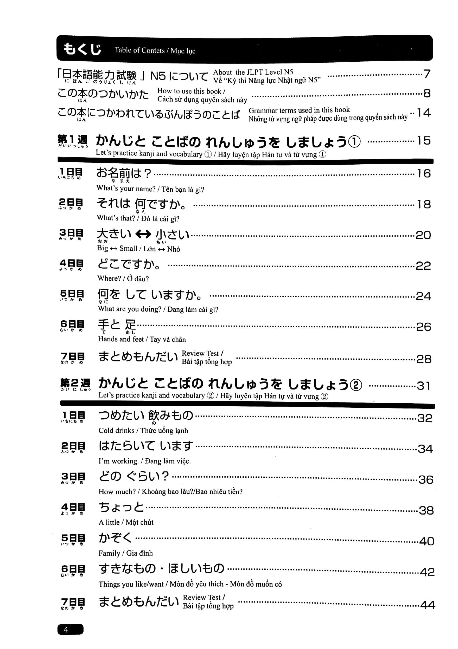 Bộ sách gồm 1 quyển: "Hán tự (Kanji) - Từ vựng (Goi) - Đọc hiểu (Dokkai) - Nghe hiểu (Choukai) - Ngữ pháp (Bunpou)