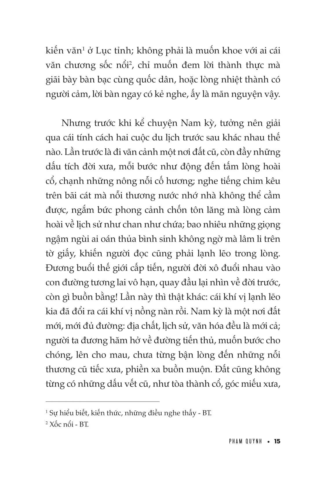 Phạm Quỳnh quan sát tỉ mỉ và không quên so sánh Bắc kỳ với “vùng đất mới”, qua đó khắc họa được chân dung xã hội, bức tranh toàn cảnh về đất nước ở một thời đoạn lịch sử: “Cái hình thức của thành phố Sài Gòn sánh với thành phố Hà Nội còn hơn nhiều. Từ cách đặt đường phố cho đến cách dựng cửa nhà, từ cách thắp đèn điện cho đến cách đặt máy nước ở các nhà, cho đến cách tuần phòng vệ sinh trong phố xá, nhất nhất đều có tiến bộ hơn Hà thành ta cả. Ở Sài Gòn thật là có cái cảm giác một nơi đô hội mới, nghĩa là một nơi đô hội theo lối Tây. Vào đến Chợ Lớn thì lại ra cái cảm giác một nơi đô hội theo lối Tàu. Còn các châu thành khác ở Lục tỉnh, thì những nơi quan sở là Tây mà chốn phố phường là Tàu, phần An Nam thật ít lắm. Xét về phương diện đó thì những đô hội Bắc kỳ tuy coi cũ kỹ mà còn có cái vẻ An Nam hơn.”