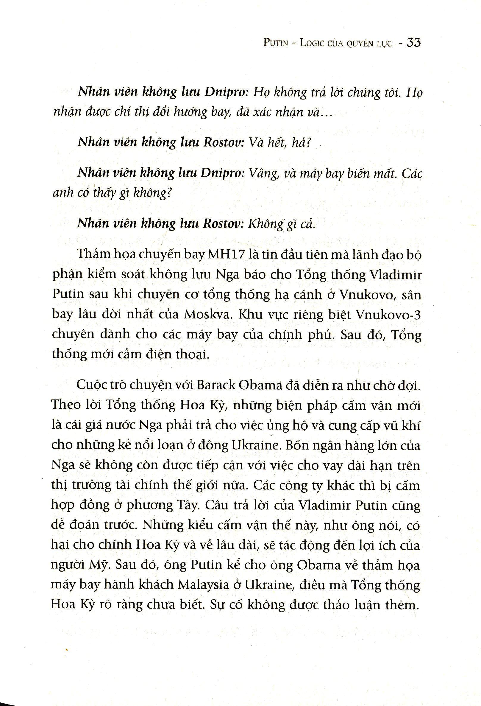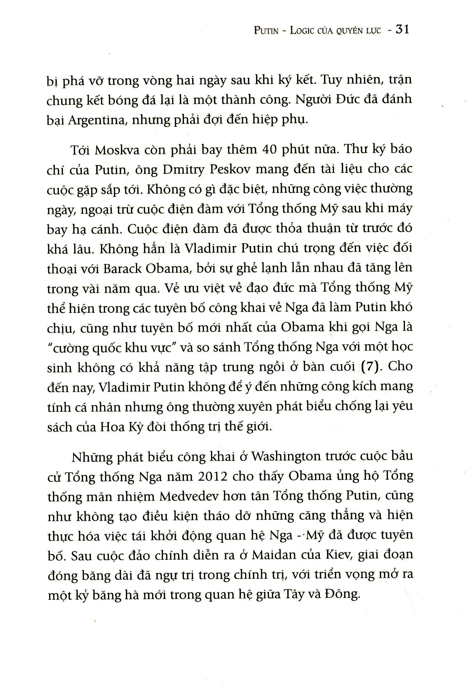 Trong mắt phương Tây, Putin hiện lên như một kẻ hiếu chiến và bị quy tội cho mọi cuộc khủng hoảng, từ cuộc chiến tranh Chechnya, cuộc xung đột ở Uckraine đến việc máy bay MH17 của Malaysia Airline bị bắn rơi. Đọc Putin Logic Của Quyền Lực, người đọc sẽ nhận ra, trong suốt 15 năm (cho đến thời điểm cuốn sách ra đời), ông bền bỉ, miệt mài làm việc – có khi lên đến 16 tiếng đồng hồ mỗi ngày, di chuyển khắp nơi, tìm kiếm những cơ hội cũng như đối phó lại những âm mưu chia rẽ từ các quốc gia khác. Ông tìm cách ổn định kinh tế, thống nhất Chính thống giáo Nga trong nước và hải ngoại, sáp nhập Crime vào lãnh thổ Nga, phản đối sự mở rộng của Nato về phía Đông… Để rồi sau tất cả, ông đã chạm vào trái tim của người Nga bằng việc khôi phục lòng tự trọng đã bị suy sụp của nhân dân mình. Khi Putin nhậm chức tổng thống, gần 1/3 người Nga có thu nhập thấp hơn mức nghèo khó, thì giờ con số đó chỉ còn 11%; tuổi thọ trung bình tăng từ 65 lên 70, mức sinh tăng trở lại sau nhiều năm sụt giảm… Những con số biết nói ấy giải thích vì sao, người dân Nga lại yêu quý ông đến thế. Trong cuộc điều tra mới nhất, tỉ lệ ủng hộ Tổng thống Putin ở Nga tuy có giảm nhưng vẫn ở mức trên 80% - một con số ấn tượng và không phải nhà lãnh đạo nào cũng làm được điều đó!