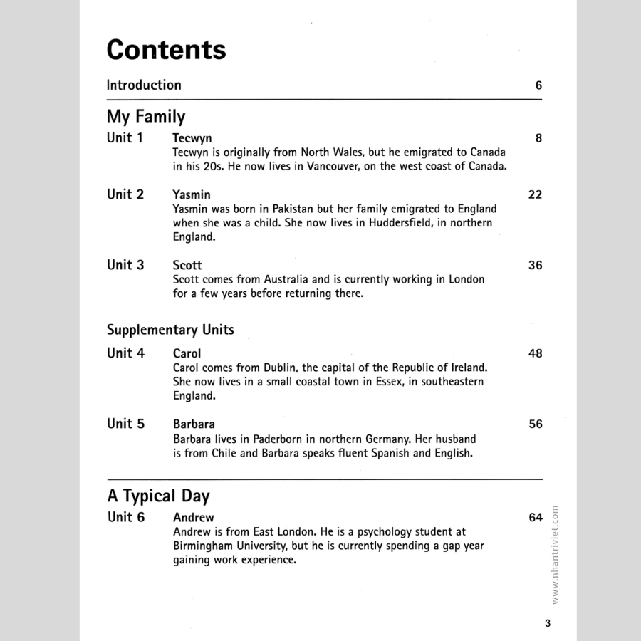 Bộ sách gồm 3 tập ở 3 cấp độ khác nhau: Elementary, Intermediate (B1 - B2) và Advanced (B2 - C1), với 15 bài học. Chủ đề các bài học tập trung vào những nội dung chính sau: May Family, A Typical Day, A place I know well.