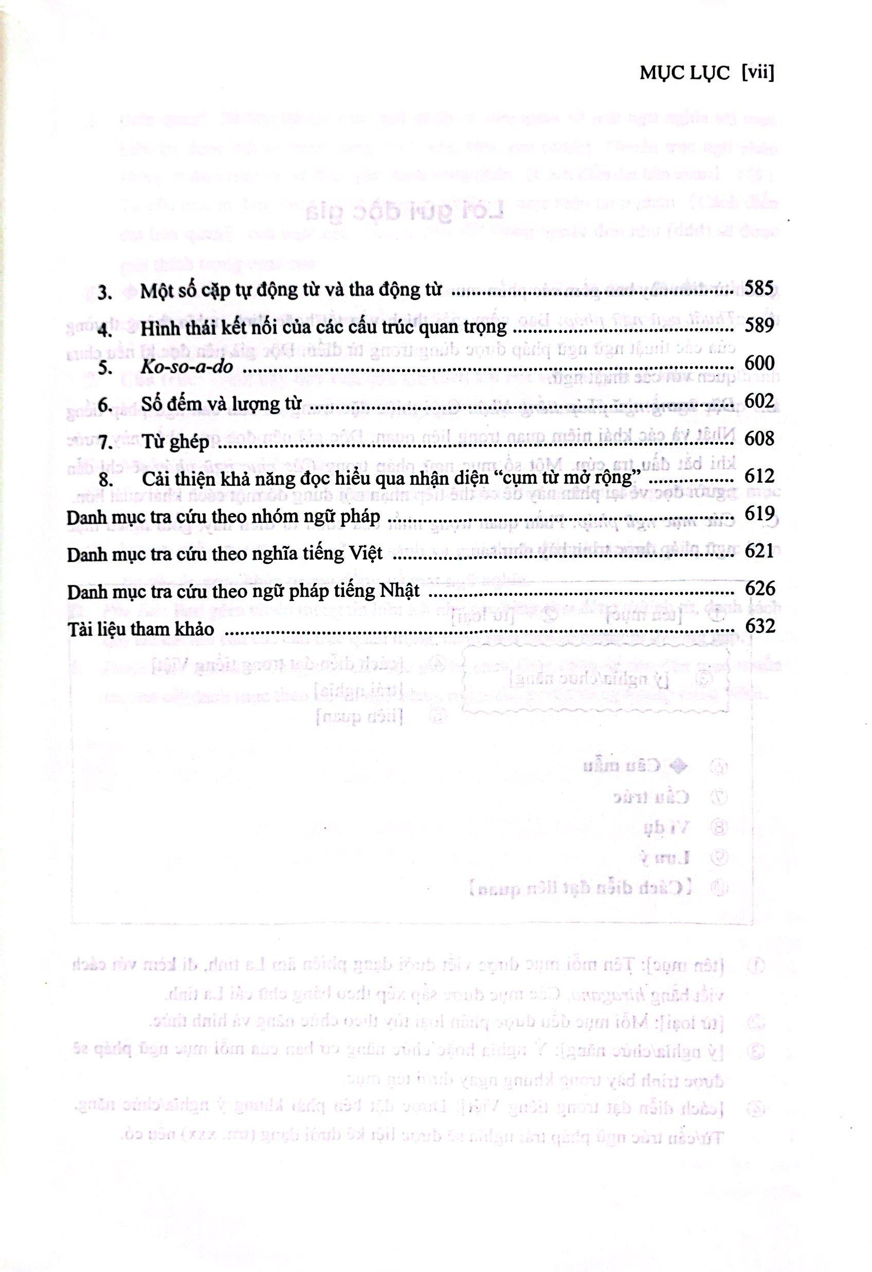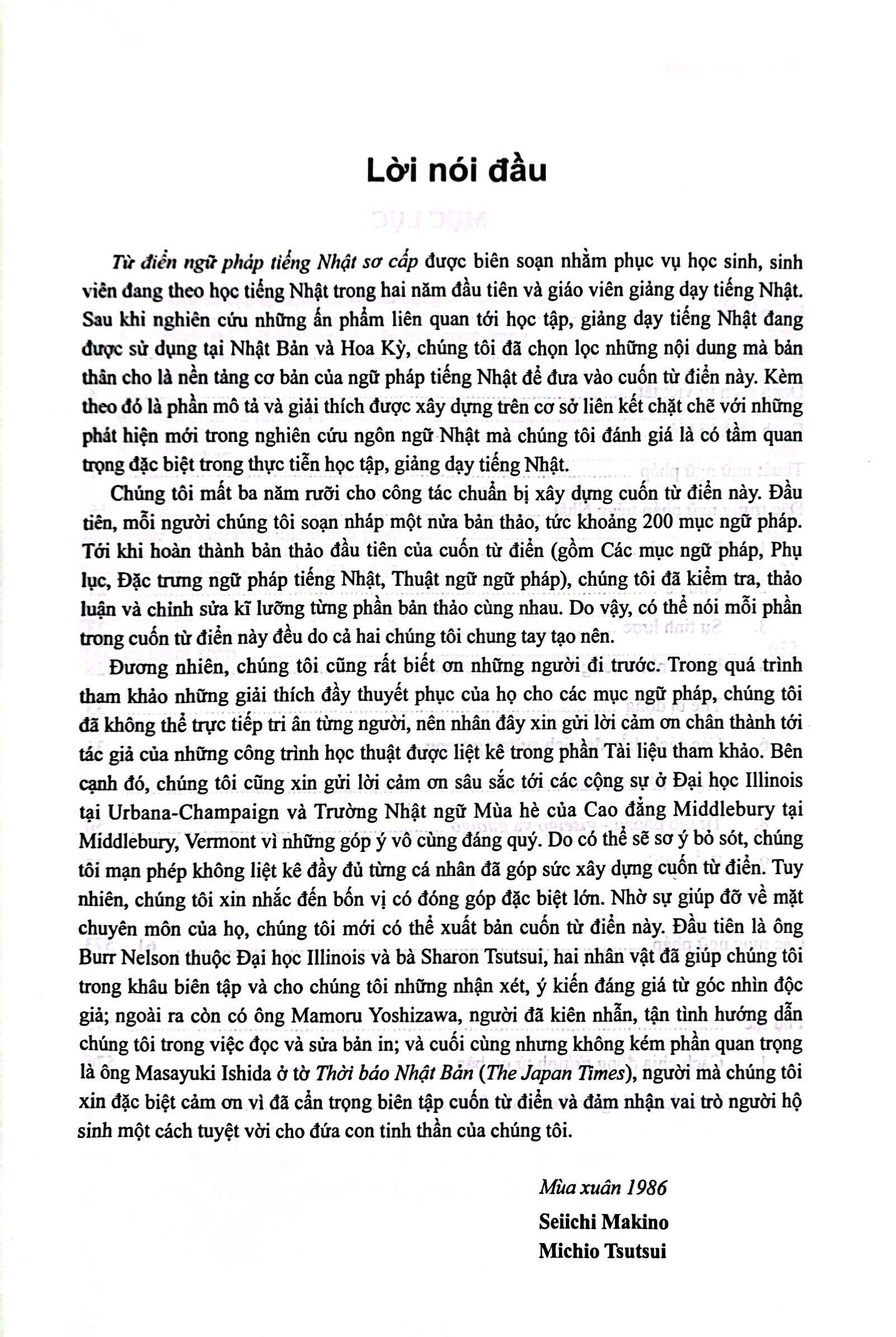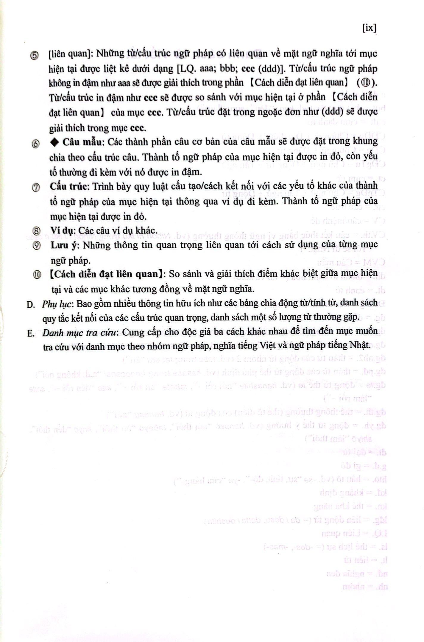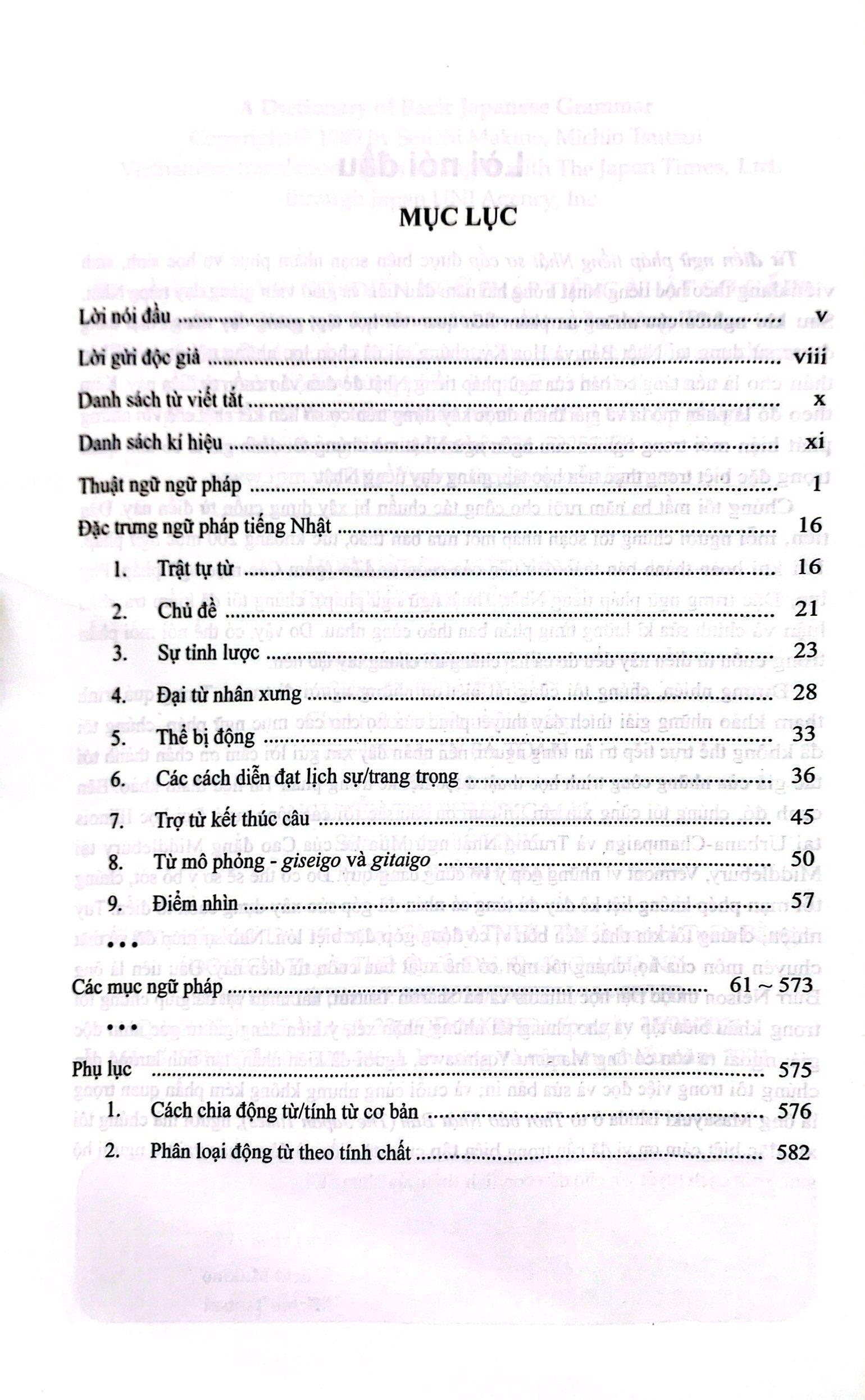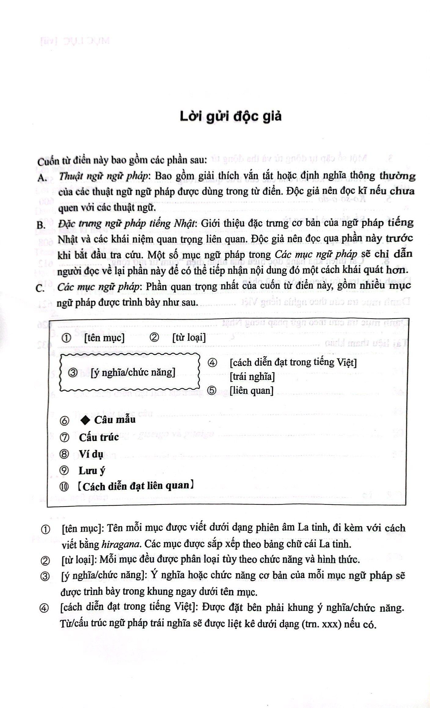 TỪ ĐIỂN NGỮ PHÁP TIẾNG NHẬT SƠ CẤP là ấn phẩm liệt kê và giải thích chi tiết các mẫu ngữ pháp tiếng Nhật trình độ sơ cấp theo phương pháp trình bày của một cuốn từ điển. Điểm đặc biệt hữu ích là ngoài giải thích chi tiết, nêu ví dụ phong phú, TỪ ĐIỂN NGỮ PHÁP TIẾNG NHẬT SƠ CẤP còn so sánh các mẫu ngữ pháp mang ý nghĩa tương đồng, giúp người học hiểu sâu và vận dụng chính xác ngữ pháp tiếng Nhật trong hoàn cảnh cụ thể.